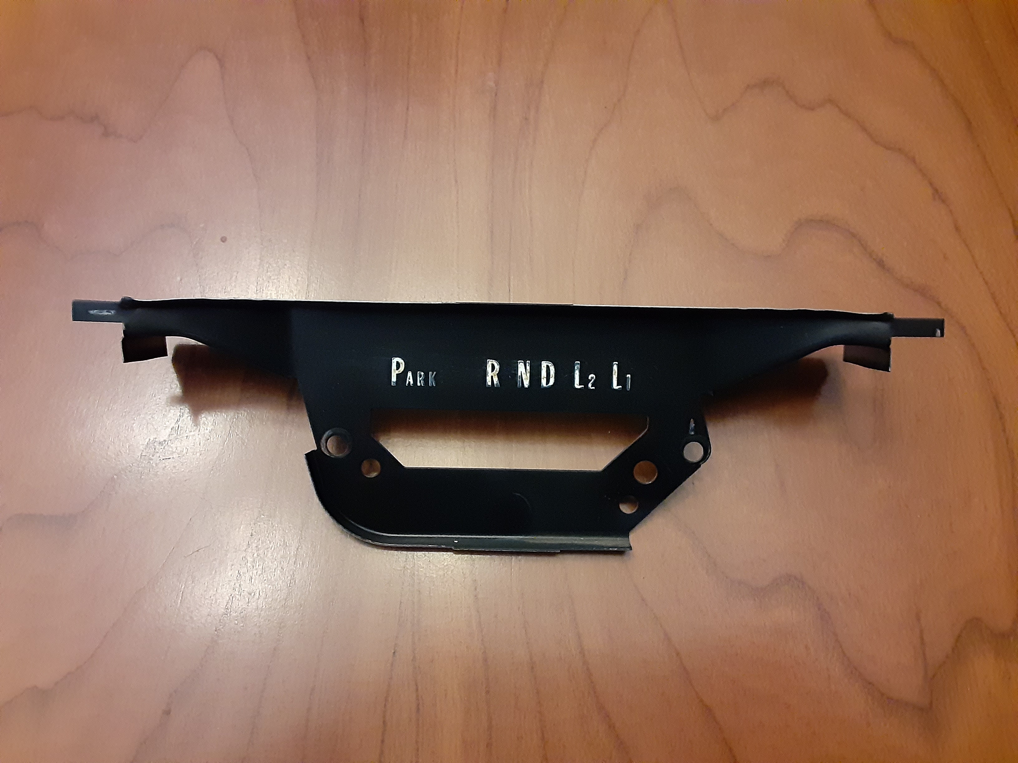 This panel is mounted right behind the indicator needle, and holds it and the routing bracket in place. My car uses a Powerglide, so only has Low and Drive labels. This panel shows L1 and L2, so it obviously came from a three-speed car. That may be of interest to anyone that wants to swap in a TH350 or TH400.